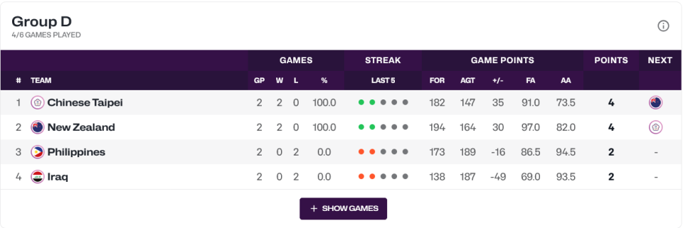 本组形势比较明朗,中国台北与新西兰皆取得2连胜,双方将在末轮交锋争夺小组第一。菲律宾在末轮以66-57击败伊拉克,从而排名小组第三晋级附加赛,而伊拉克3连败垫底出局。
