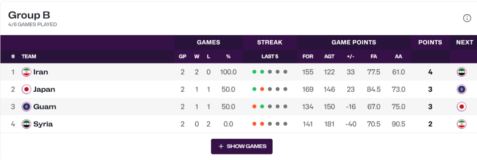 日本男篮与关岛男篮将在末轮交锋,双方的胜者将获得小组第二,负者排名小组第三。此外,叙利亚队遭遇2连败,确定小组排名垫底出局。